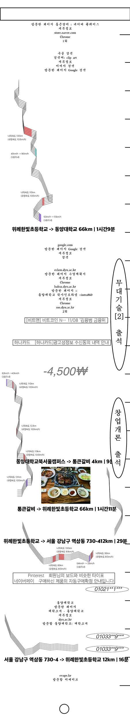 정하윤은 1년 동안의 기록(2018.5-2019.5)을 수집한 뒤 데이터를 통해 자신에 대해 다시 되돌아보고 나는 어떤 사람인가에 대해 파악하고자 이 프로젝트를 시작하였다. 이전 일상은 시간이 지나면 그의 기억 외에 사라지는데 현재는 그가 어디서 어떻게 무엇을 하였는지 모든 기록이 남아있다. 그것이 어디까지 추적되고 재구성할 수 있는지 개인 정보 데이터 8가지가 바탕이 되어 작업하였다.